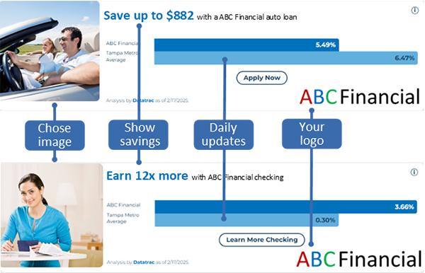 RateNet Competitive Comparison Banner Ads compare your current rates to the market average to show borrowers and depositors how much more they save or earn with you.