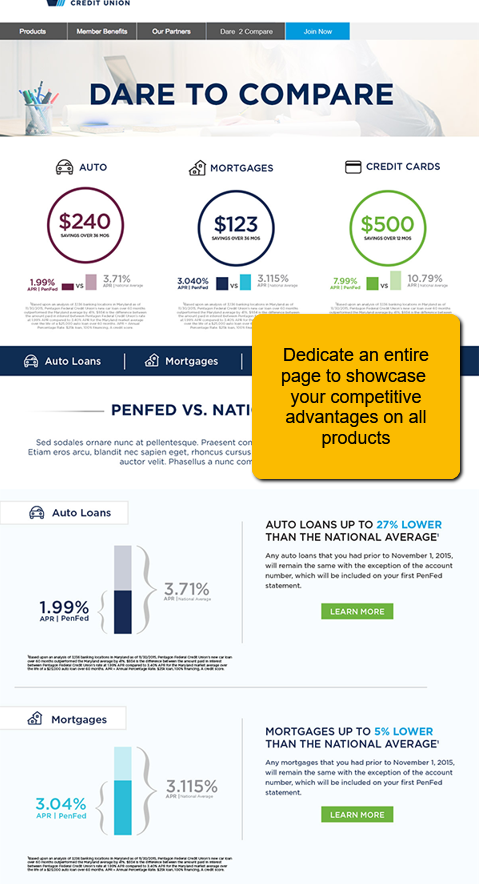 Install a link on your main menu or a link on your rates page stating ‘See how our products compare” or “Compare our rates”. Link this to your Competitive Comparison Page. |