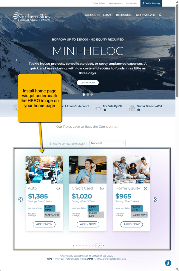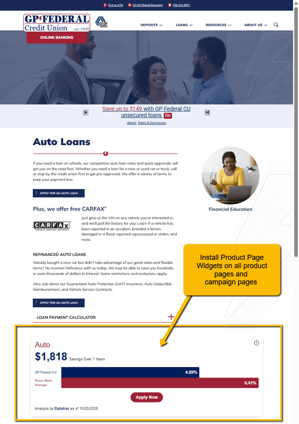 Install Product Pages Widgets above the fold on product pages (e.g. CD page, auto loan page, mortgage page, etc.) or campaign landing pages. Drive traffic to Product Page Widgets from Value Statements or Banner Ads to increase deal flow and conversion rates. |