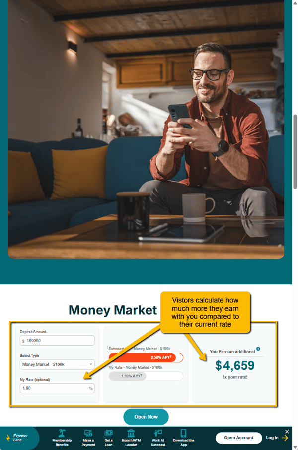 Savings Estimator Widgets allow visitors to calculate how much more they will save or earn by moving business from another financial institution to you.