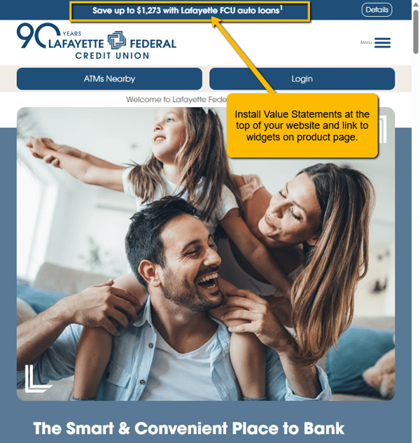 Value Statement Widgets are one line of text stating how much your loan rates save or how much more your depositors can earn with you compared to the competition. Value Statements may be set up to showcase one product or may scroll many products. They may be used anywhere on your site and link directly to your product page with Product Page Widgets. The text and calls-to-action automatically resize to the space in which Value Statements are displayed.