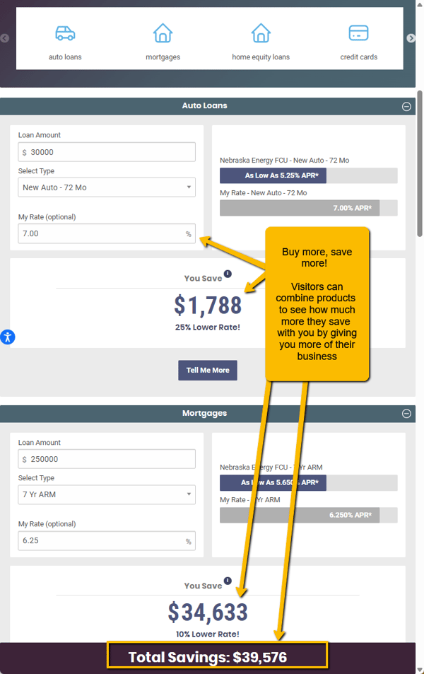 One Deposit or Loan Product (e.g. auto loan, CDs, Mortgages, etc.) Competitor Comparison Charts (Premium) Savings Estimator Widgets (Premium)