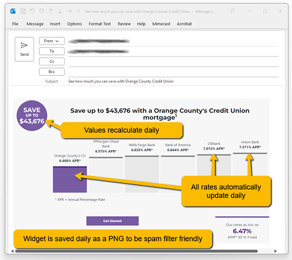 Email Widgets convert RateNet Competitive Comparison Widgets into a PNG image file that may be imbedded in an emails. The image file is updated daily to always display current rates.