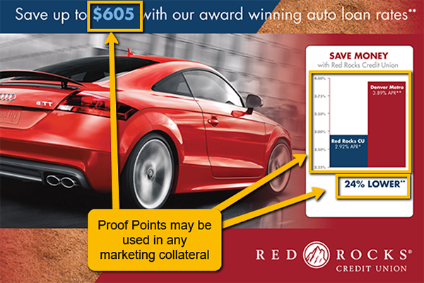 RateNet Proof Points may be used on any marketing campaign collateral to put proof in your marketing. Proof Points give you the documentation needed to make claims such as "Our checking rates are 7x the national average" or "Save $800 on your next auto loan."