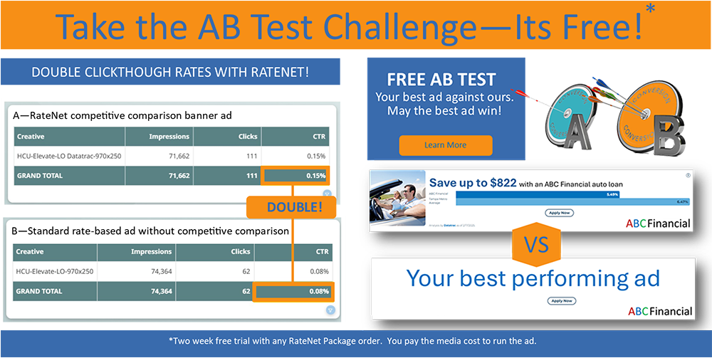 Don't just show rates. Run a free A/B Test to compare your best performing ad to the lift you receive by showing prospects how much more they save with you using RateNet Banner Ads. |